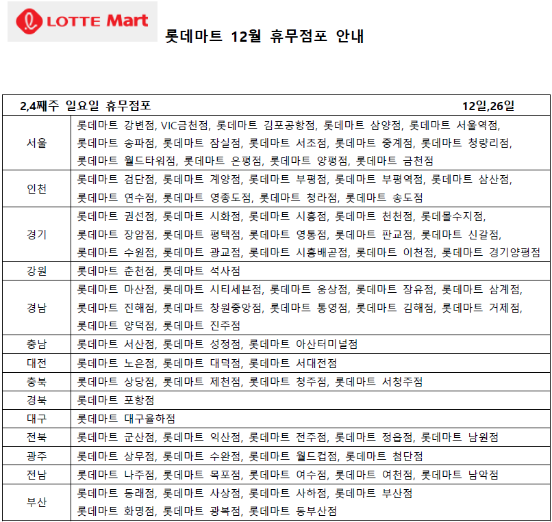 12월 롯데마트 휴무일 - 2,4째주 수요일