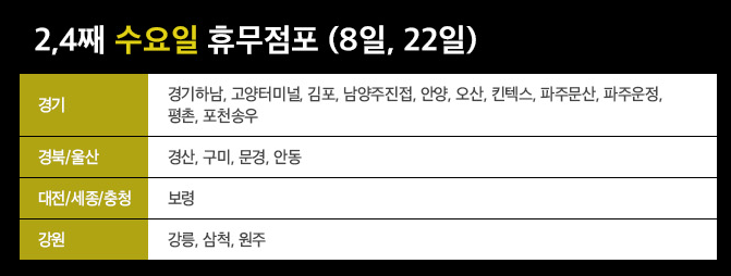 • 13일, 27일 휴무 - 논산 홈플러스, 영주 홈플러스