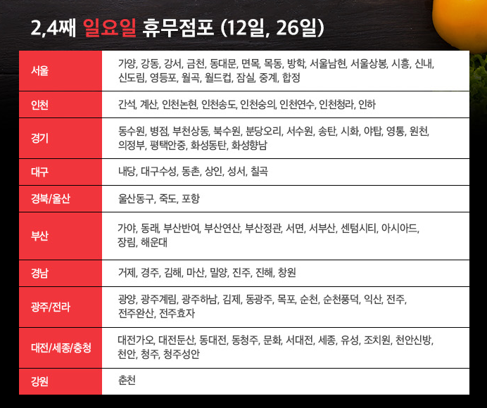 [2, 4째 일요일 휴무점포 (12일, 26일)]