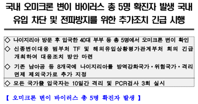 국내 오미크론 변이 바이러스 총 5명 확진자 발생 국내유입 차단 및 전파방지를 위한 추가조치 긴급 시행으로