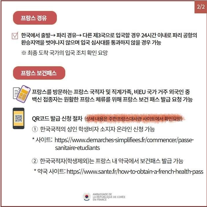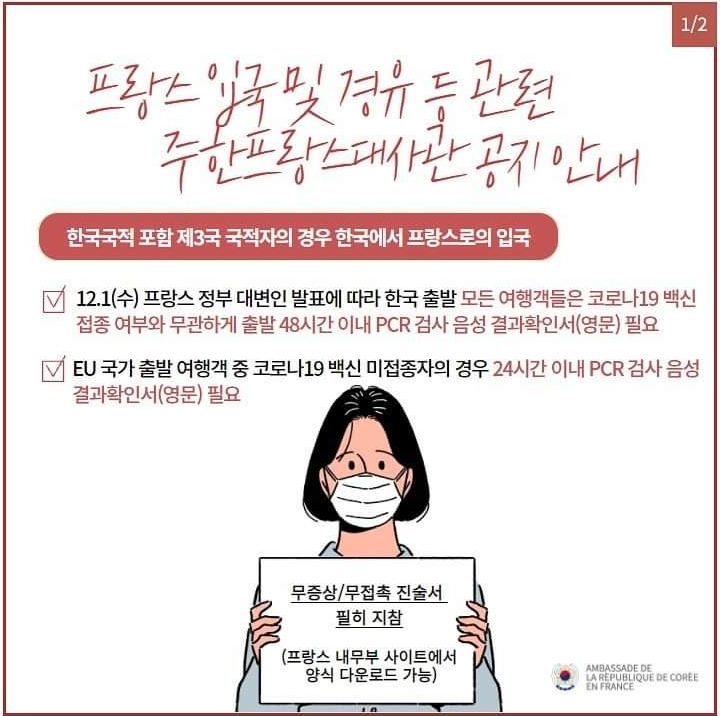 12월 1일 프랑스 정부 대변인 발표에 따라 대한민국 출발 모든 여행객들은 코로나 19 백신 접종 여부와 무관하게