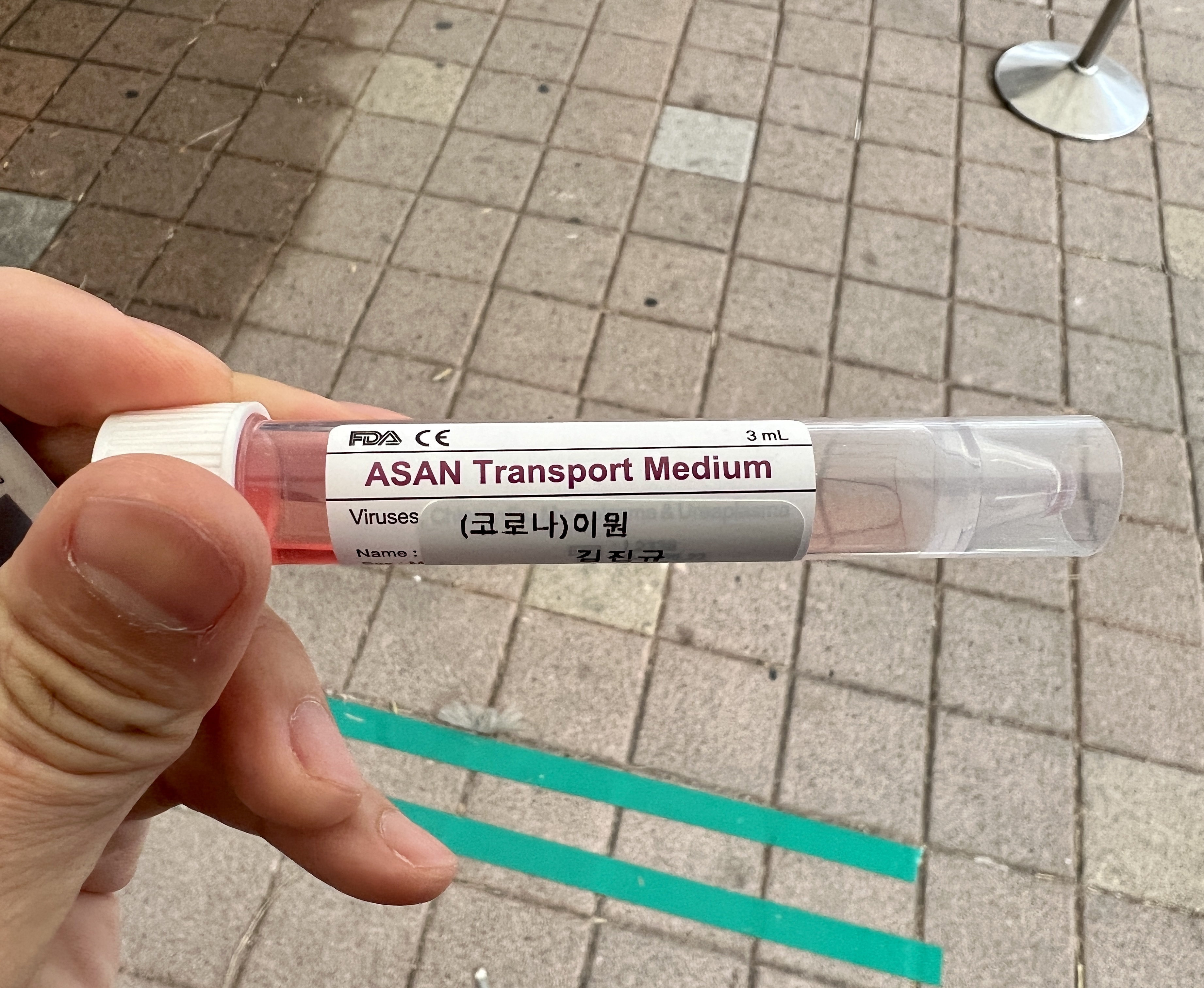 문진표를 작성하고 신분증을 제출하면 위와 같은 검사키트에 제 이름을 붙여서 주니 더블체크합니다.