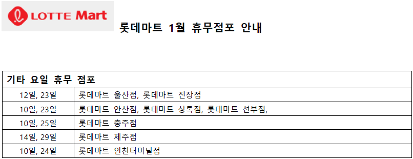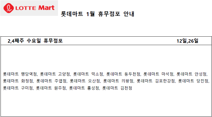 두번째로 휴무일이 많은 2,4째주 수요일인 1월 12일과 1월 26일에도 많은 롯데마트가 휴무하게 됩니다.