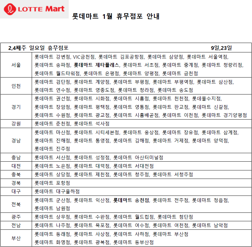 대부분의 롯데마트 점포는 2,4째주 일요일인 1월 9일과 1월 23일에 휴무합니다.