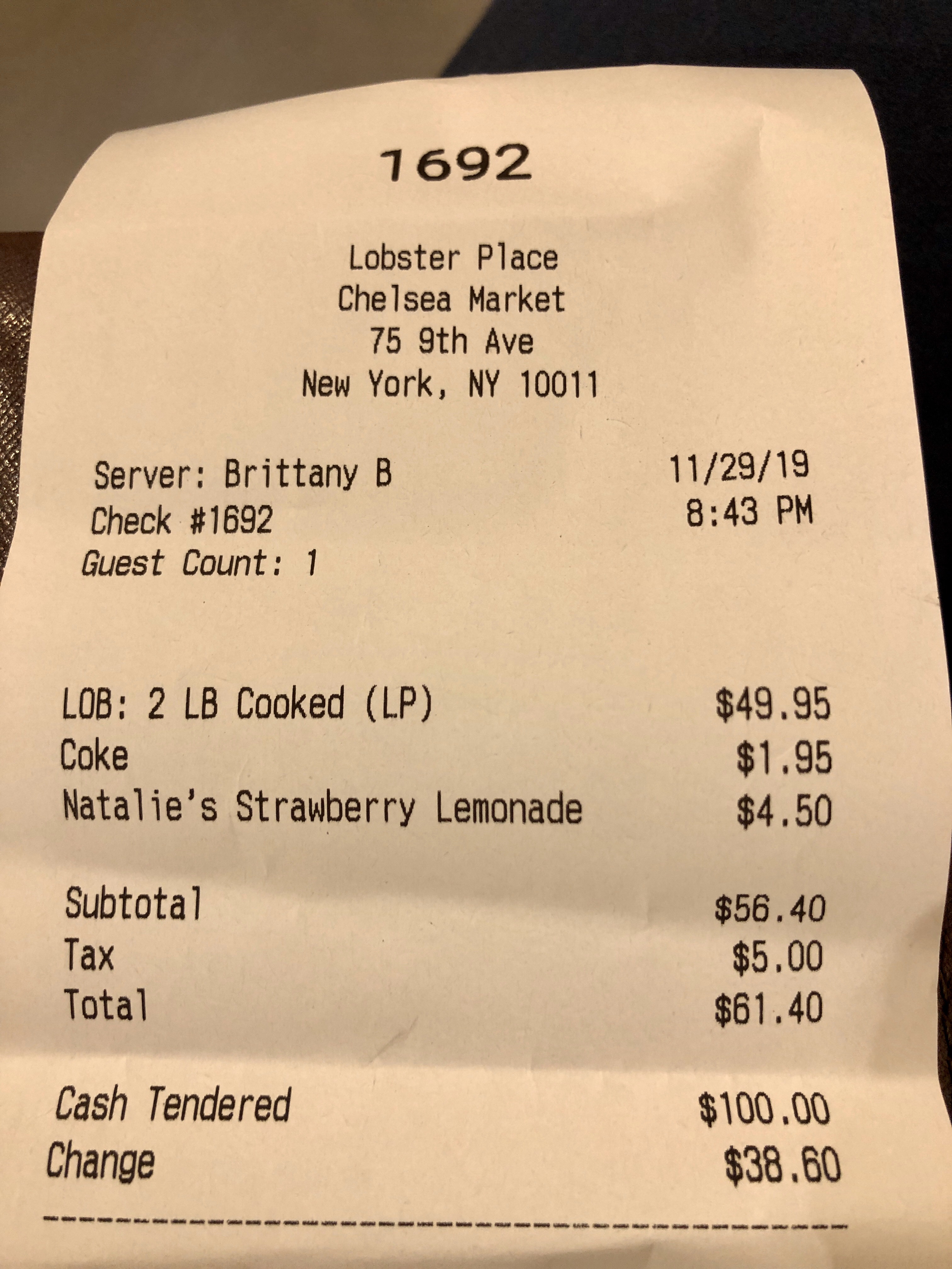 첼시마켓 랍스터 가격은 약 50달러로 레모네이드와 콜라 하나를 주문했더니