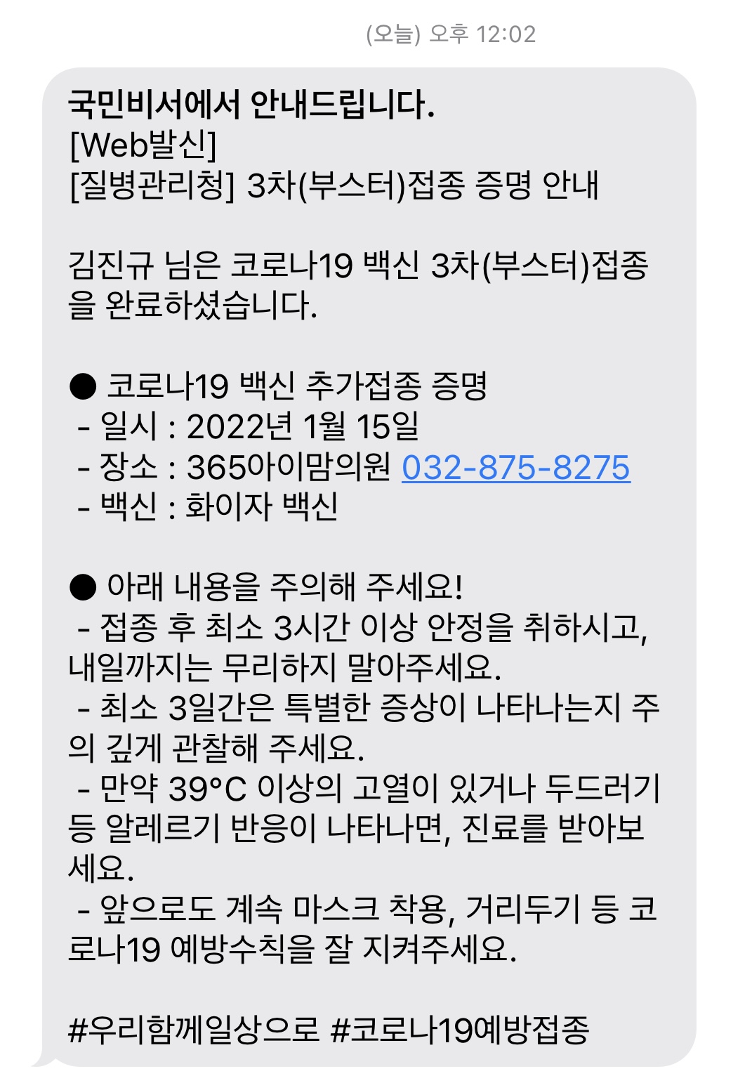 2021년 10월 14일 2차 접종이후 오늘 2022년 1월 15일에 3차 접종을 완료하였습니다.