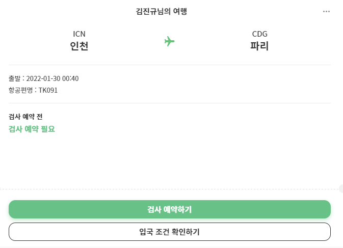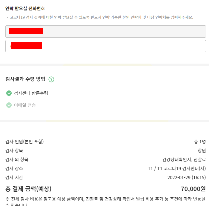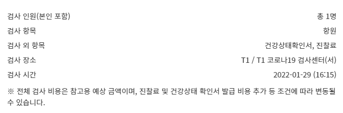 이렇게 인청공항 T1 코로나 19 검사센터(서) 에서 항원 (안티젠) 검사 예약을 무사히 마쳤습니다.