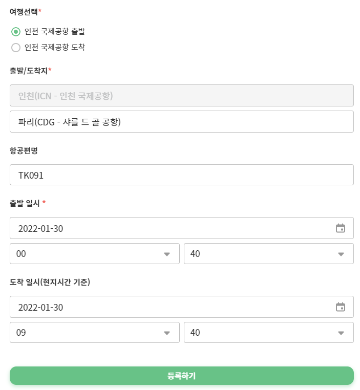 항공편명과 출발일시 그리고 현지 도착시간을 넣어주면 됩니다.