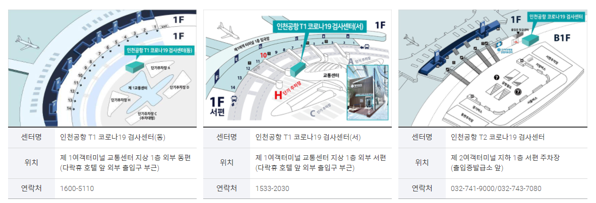 인천공항 코로나 검사센터는 총 3곳으로 터미널1 T1에 두곳이 있고 터미널2 T2에 한곳이 있습니다.