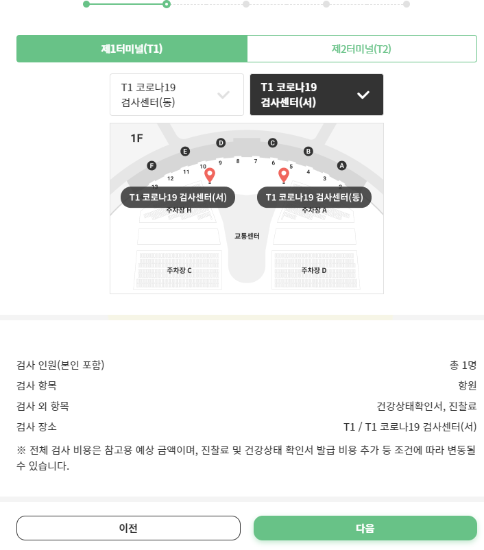검사인원과 검사항목을 정하고 검사장소가 T1 코로나19 검사센터 (서) 가 맞는지 다시 한번 확인해줍니다.