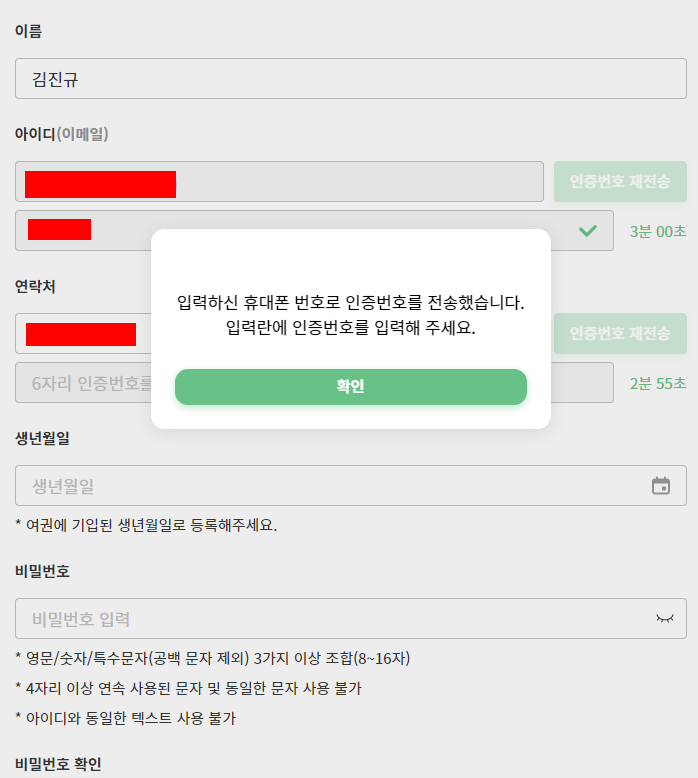 회원 가입은 이메일 인증과 휴대폰 인증을 마친 뒤 비밀번호를 설정해주면 됩니다.