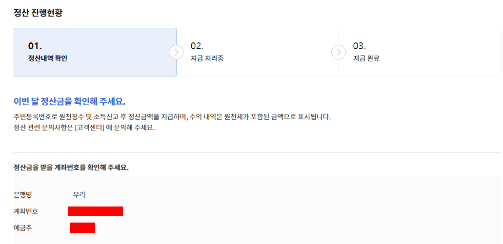정산 받은 수익은 사전에 입력해 놓은 본인명의 계좌로 다음달 15일인 2월 15일에 입금될 예정이고