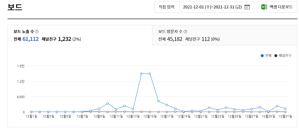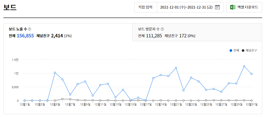 그렇다면 각 채널의 12월 보드 노출수와 보드 방문자 수를 한번 알아보겠습니다.