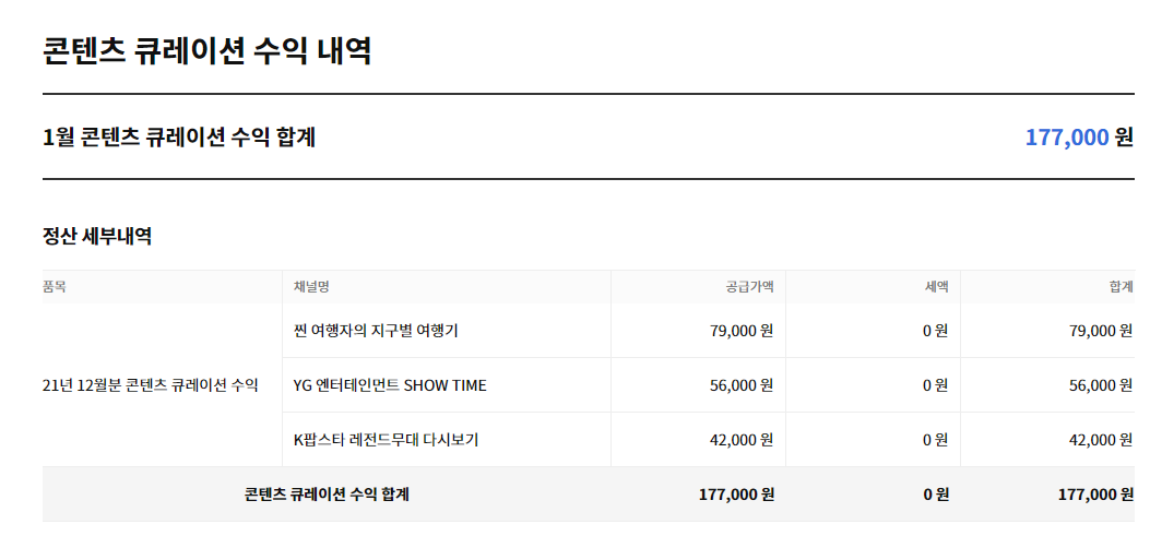 우선 결론부터 말씀드리면 12월 한달동안 3개의 채널에서 발생한 수익은 177,000원 입니다.