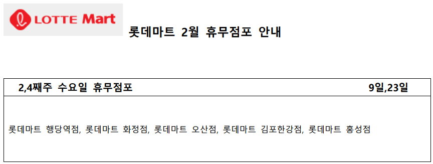 2,4째주 수요일인 2월 9일과 2월 23일에도 많은 롯데마트가 휴무하게 됩니다.