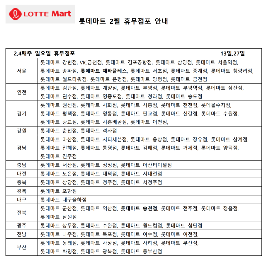 대부분의 롯데마트 점포는 2,4째주 일요일인 2월 13일과 2월 27일에 휴무합니다.