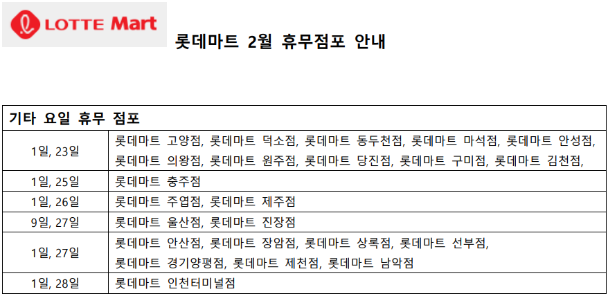 | 1일, 27일 | 롯데마트 안산점, 롯데마트 장암점, 롯데마트 상록점, 롯데마트 선부점, 롯데마트 경기양평점, 롯데마트 제천점, 롯데마트 남악점 |