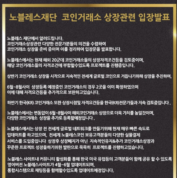 노블레스 코인 상장 관련 소식
