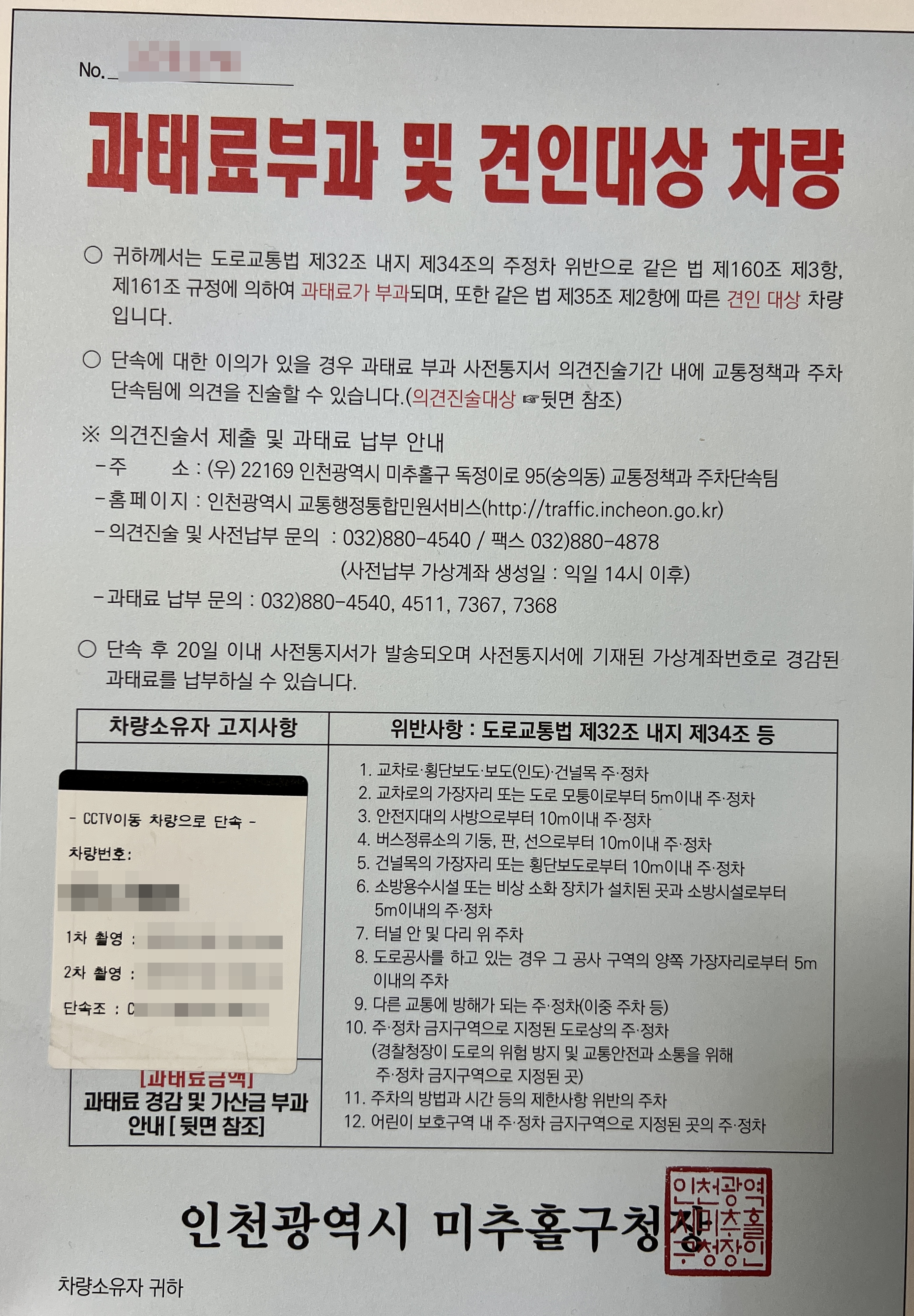 오늘 간만에 과태료부과 및 견인대상 차량 고지서를 받았습니다.