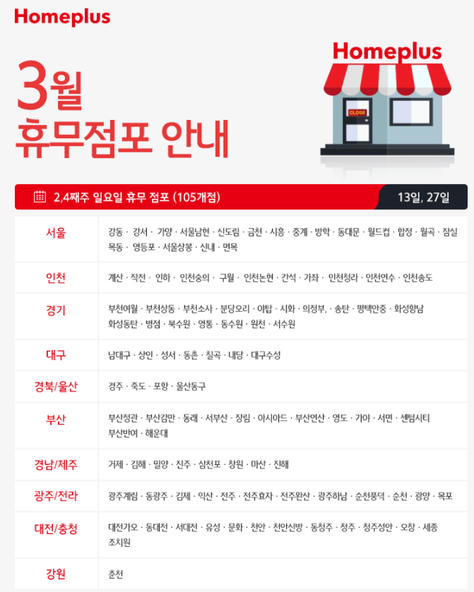 전국 대부분인 105개의 홈플러스점포가 2,4째주 일요일인 3월 13일, 3월 27일에 휴무합니다.