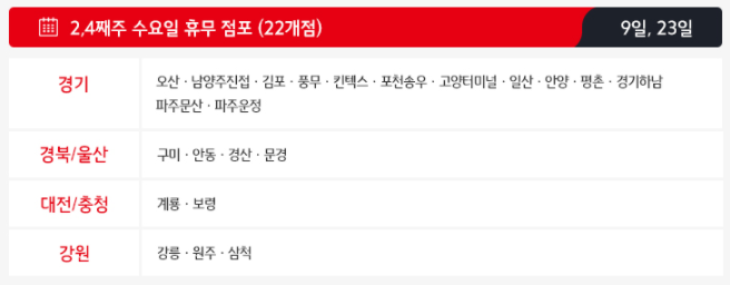 두번째로 2,4째주 수요일인 3월 9일과 3월 23일에도 22개의 홈플러스점포가 휴무하게 됩니다.