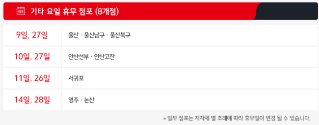• 11일, 26일 휴무 - 논산 홈플러스, 영주 홈플러스