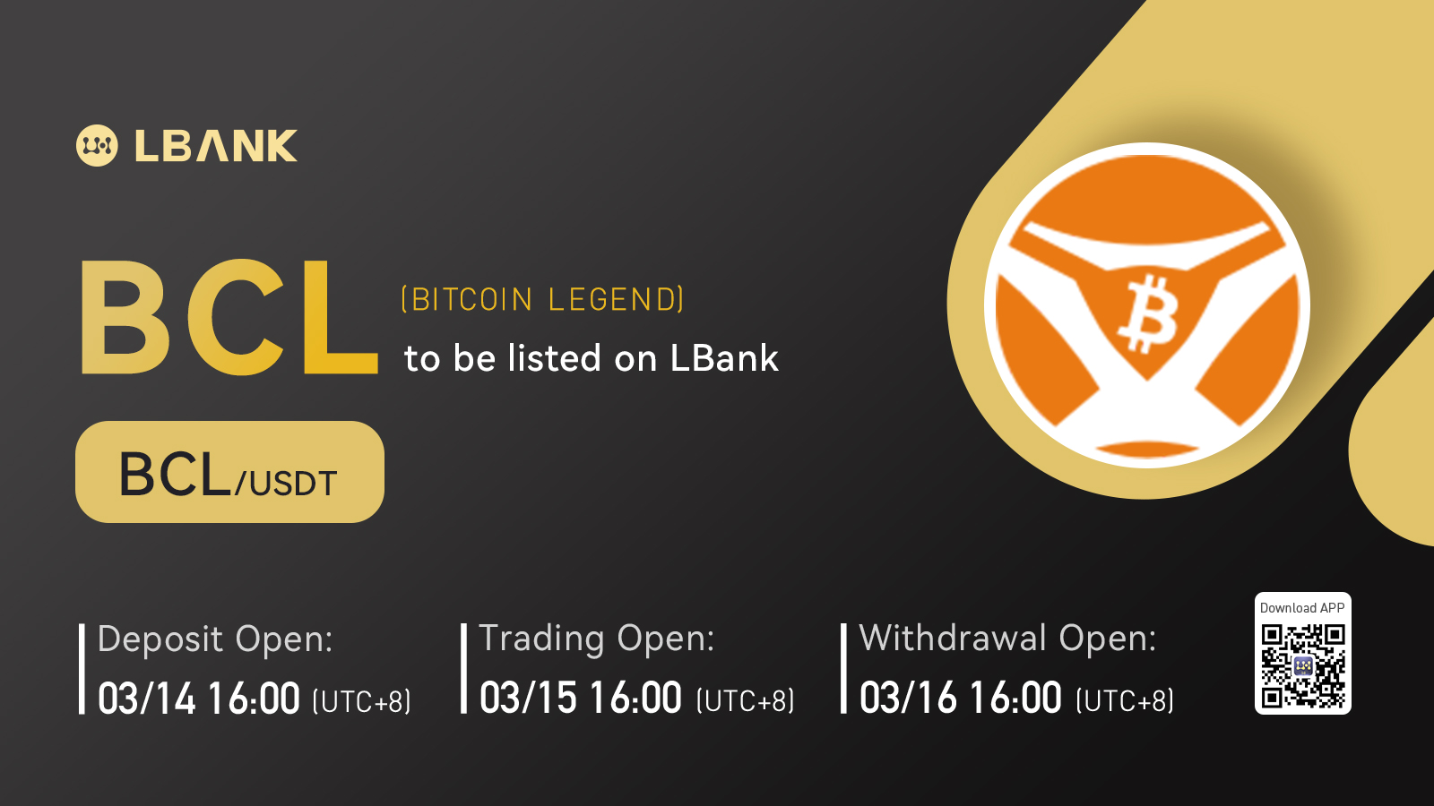 BCL(BITCOIN LEGEND) will be listed on LBank at 16:00 on March 15, 2022 (UTC+8), the details are as follows: