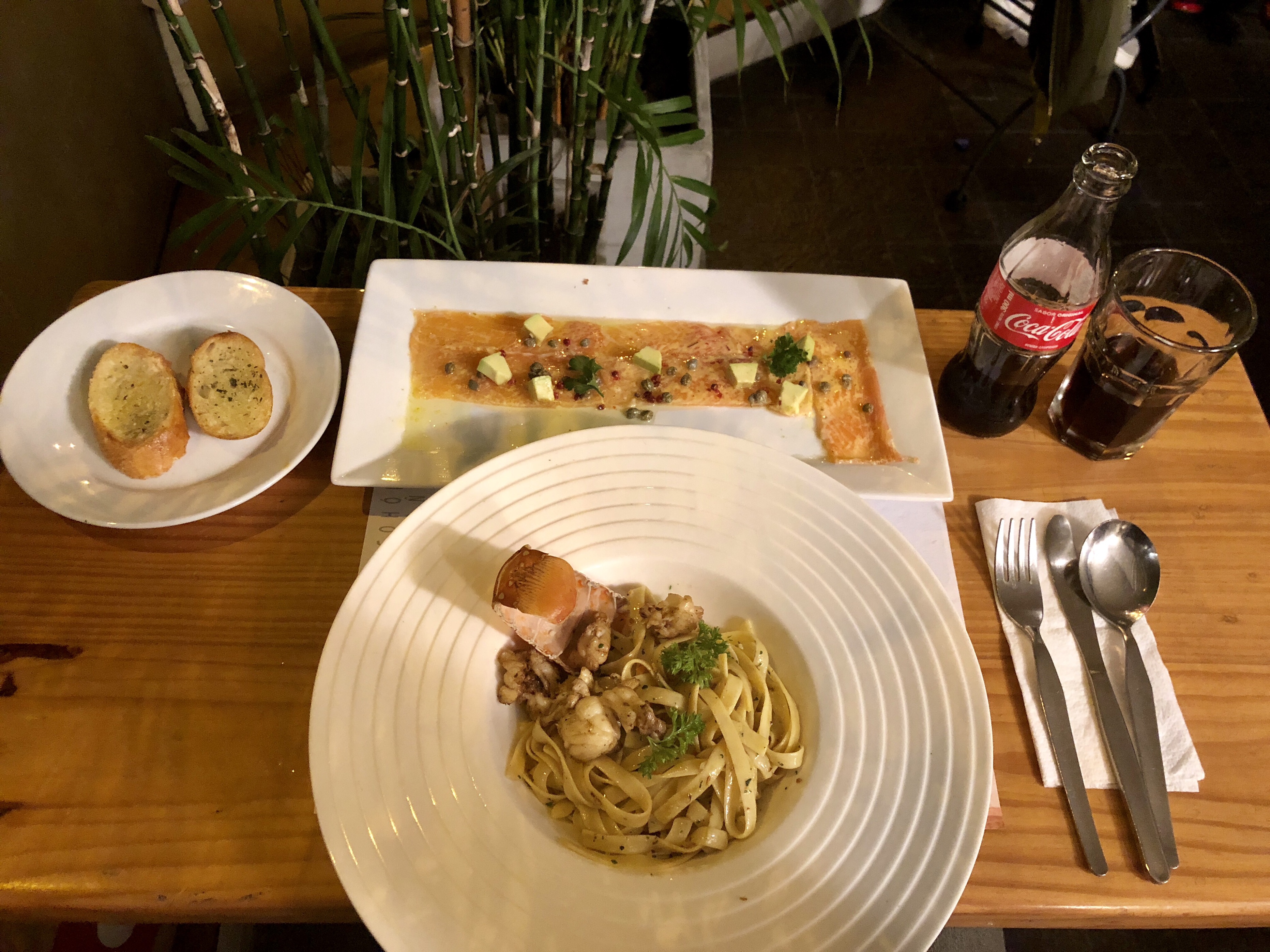 해산물 요리 전문식당이라 연어요리와 게살파스타, 그리고 마늘빵을 먹었는데 약 3-4 만원 정도 나왔던것 같다.