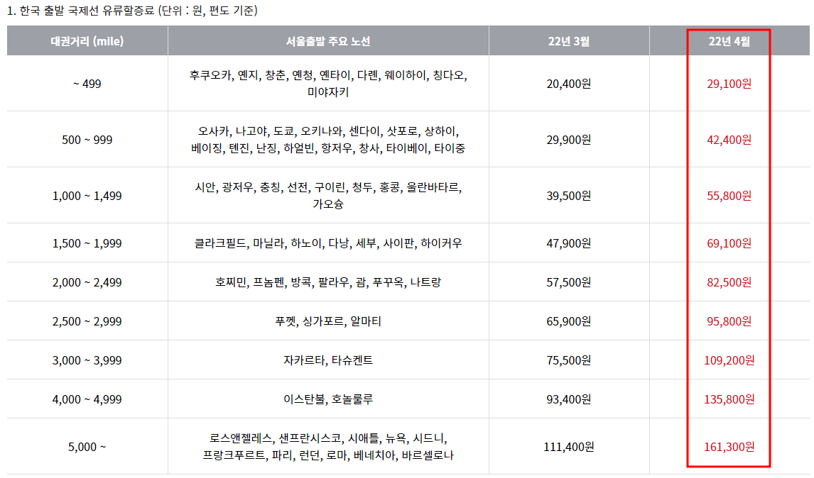 오늘은 2022년 4월 한국출발기준 국제선 유류항증료에 대한 정보입니다.
