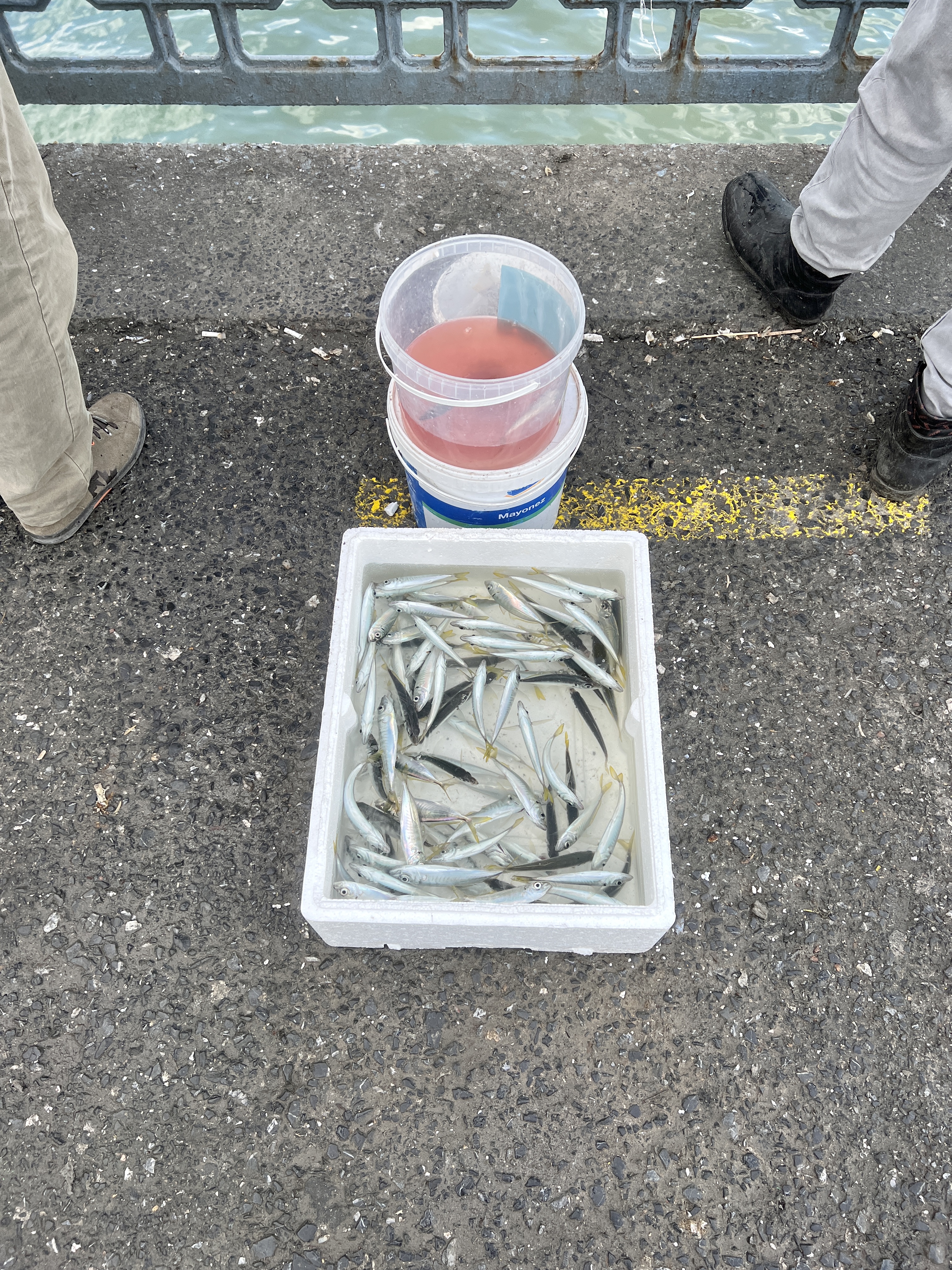 다리 아래에는 낚시로 잡은 해산물을 파는 어시장과 해산물 레스토랑이 있습니다.