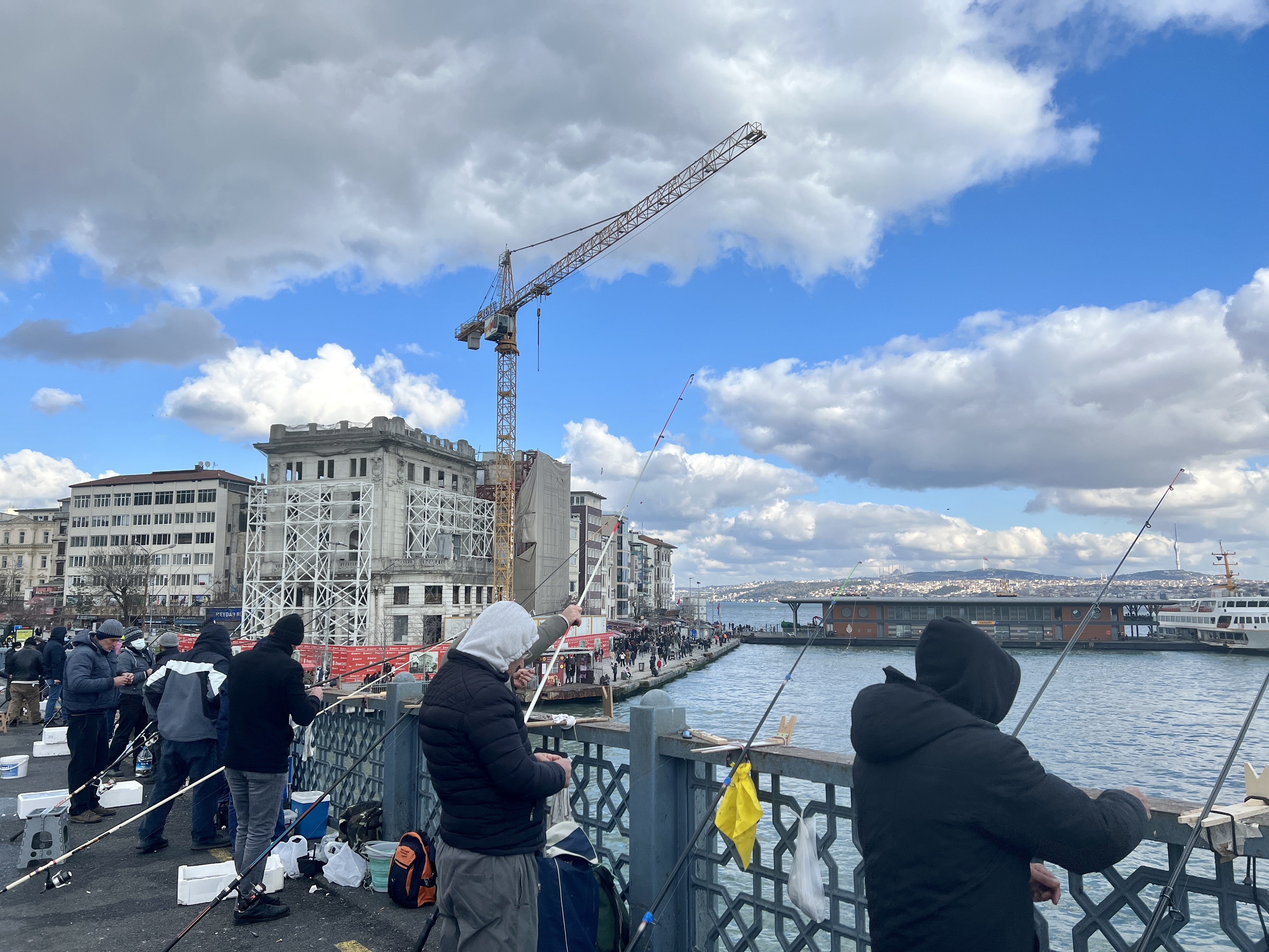 갈라타 다리 위에는 낚시를 생업으로 하는 사람들로 가득 차 있고 아래에는 다리에서 잡은 해산물을 판매하는