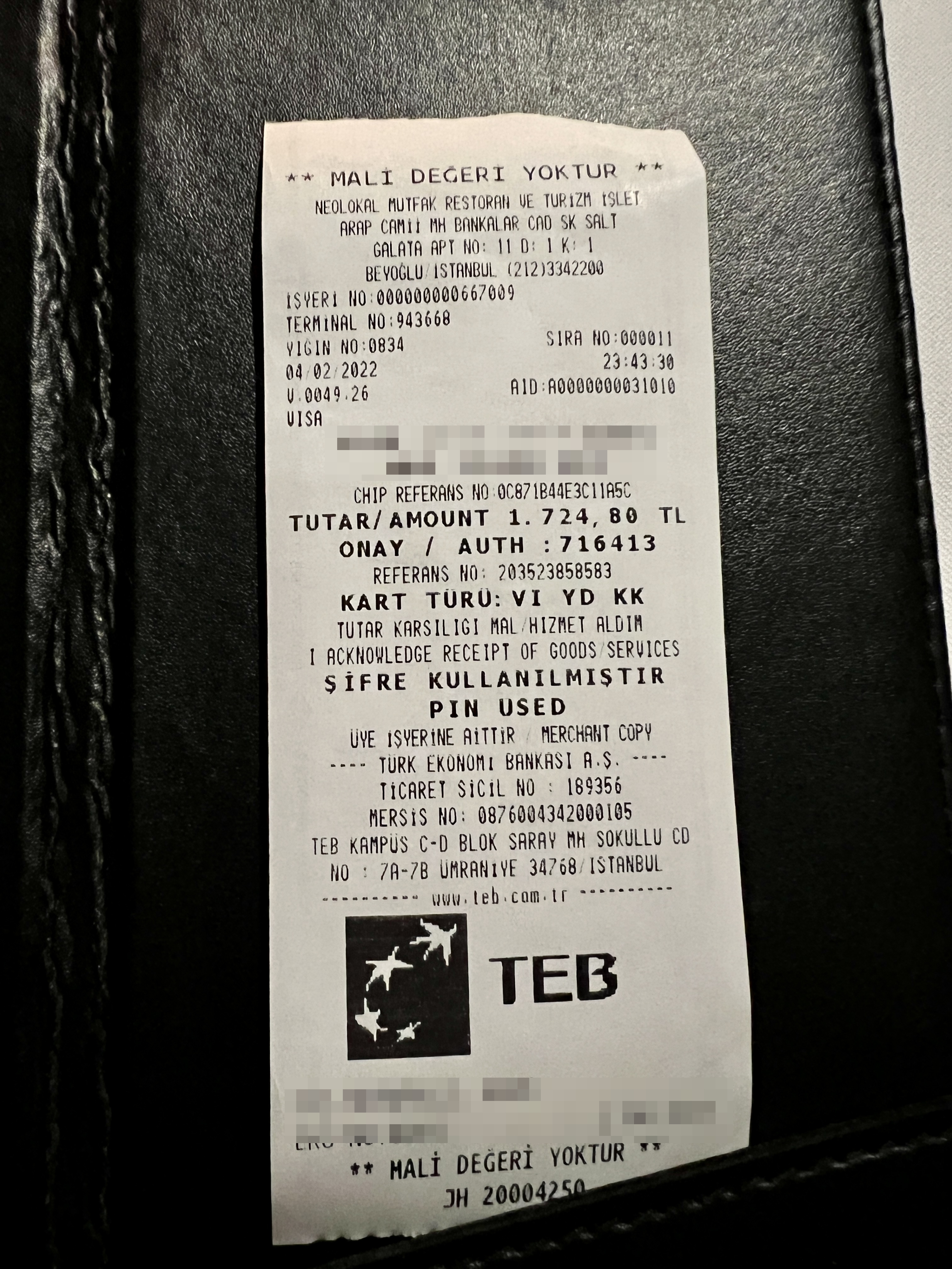 코스요리와 와인도 마셨는데, 1,724 리라 정도가 저녁식사비로 나왔습니다.