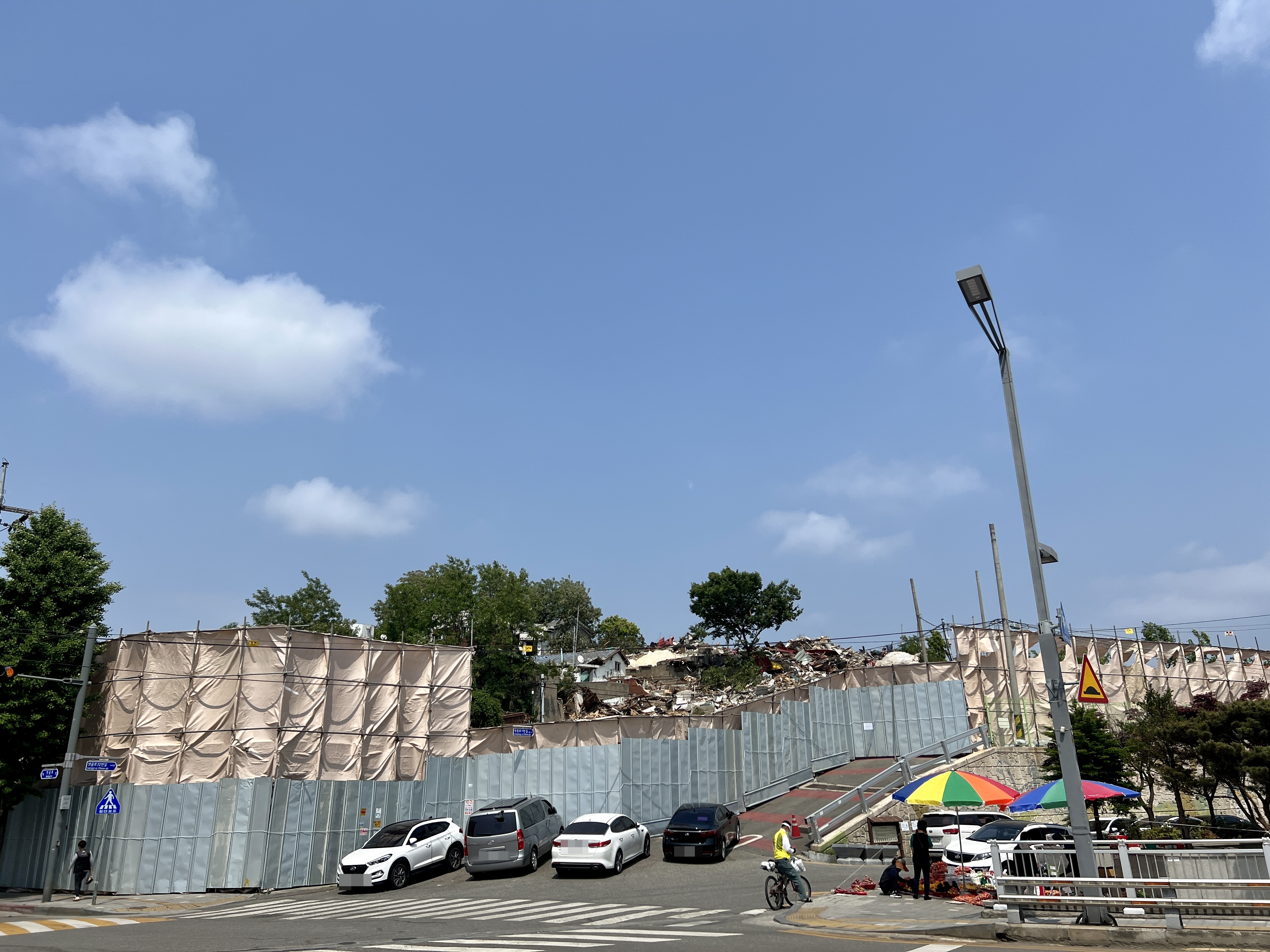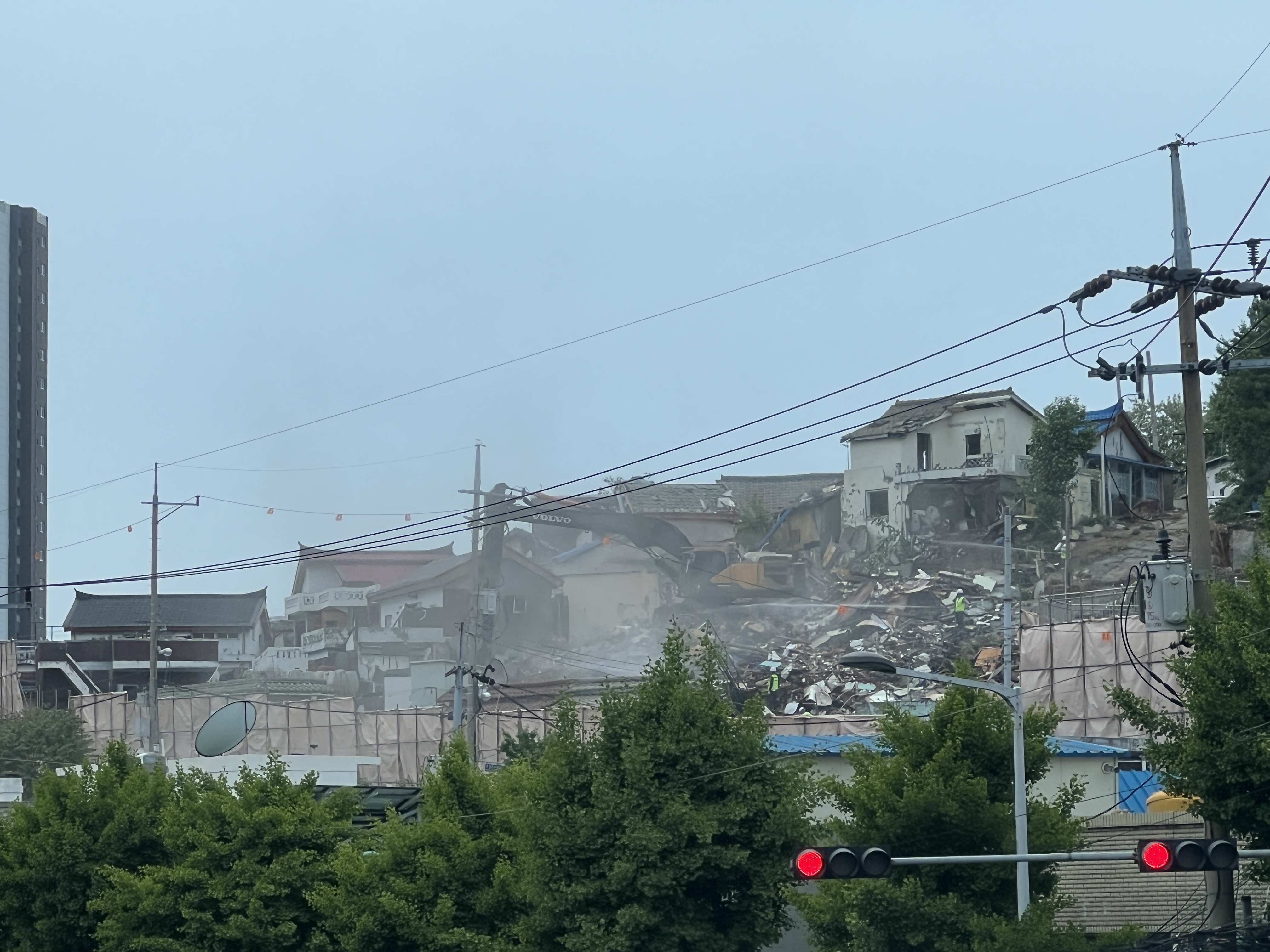 언덕길 위에 포크레인이 올라가서 열심히 물을뿌리며 철거가 한창 진행되는 모습입니다.