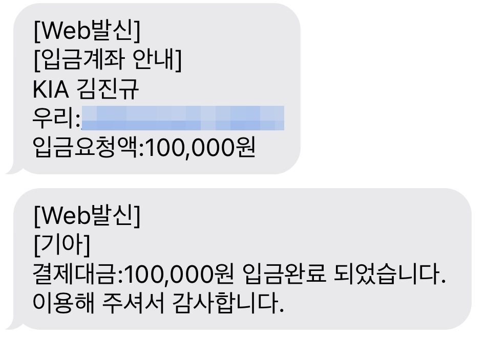 송금 후에 바로 확인문자가 도착합니다. 새차를 너무 오랜만에 구매하다보니 절차가 참 편리해졌습니다.