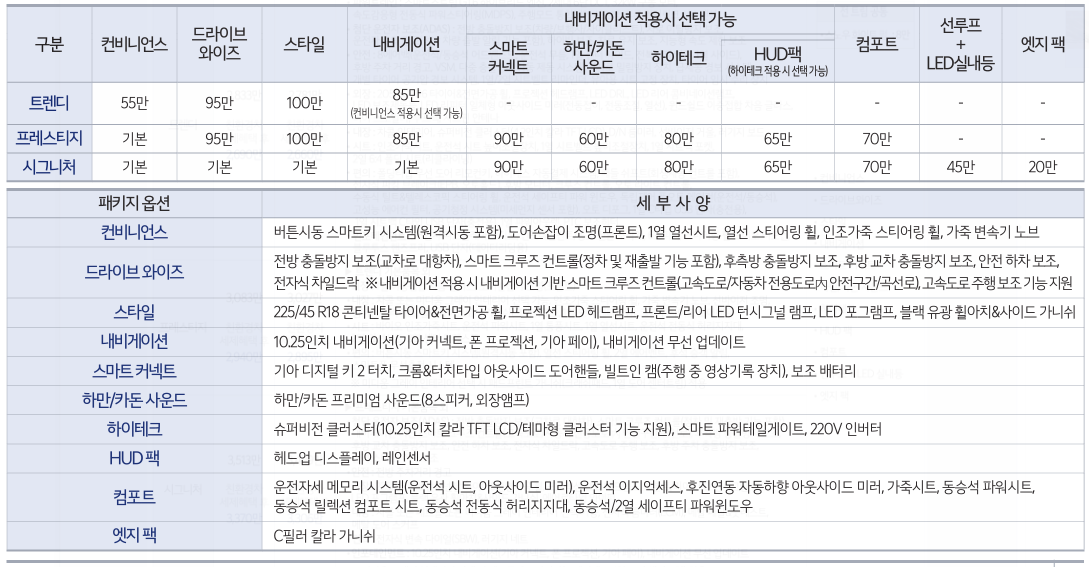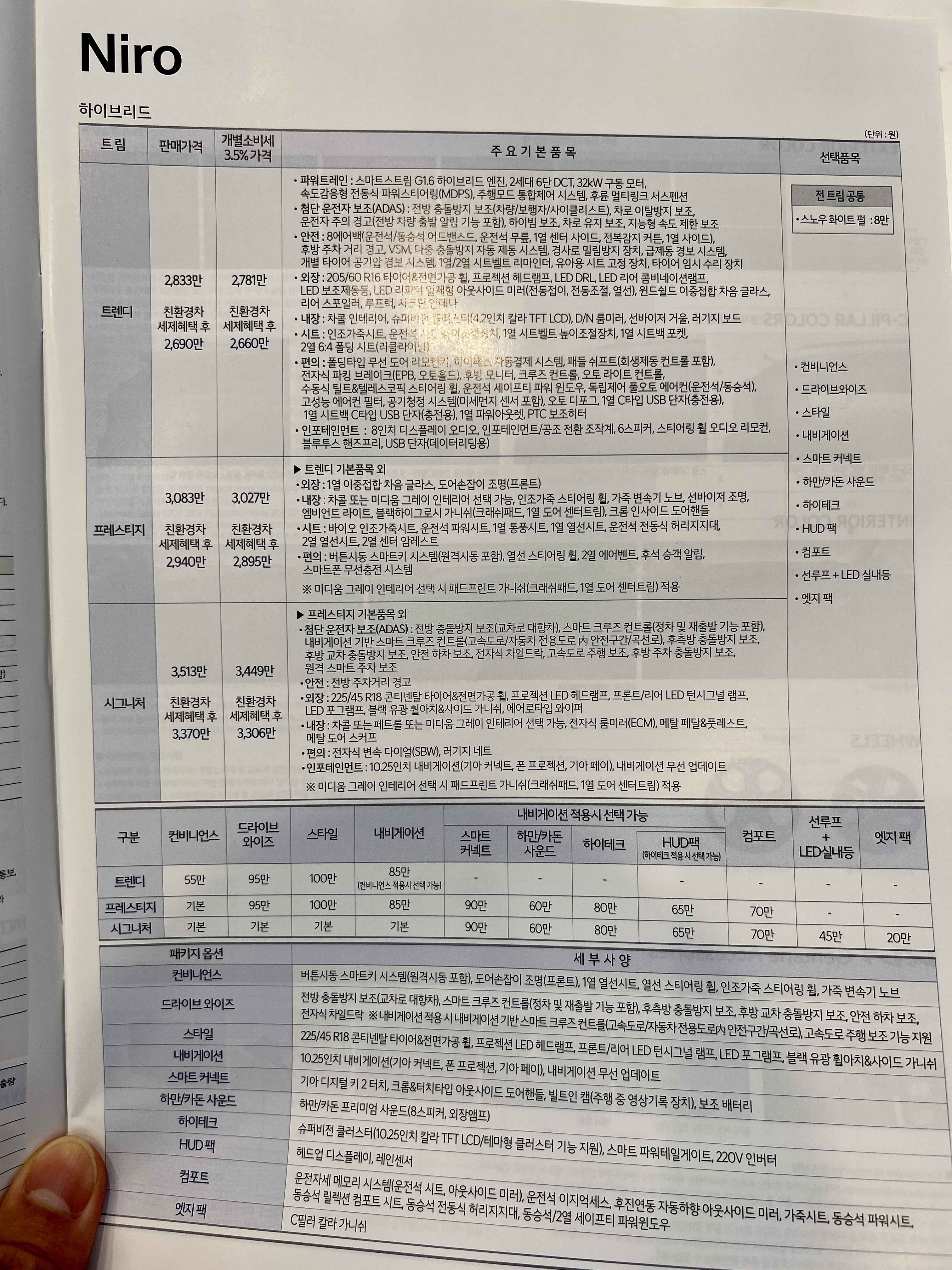 니로 하이브리드 옵션은 트렌디와 프레스티지 시그니처별로 다른데,