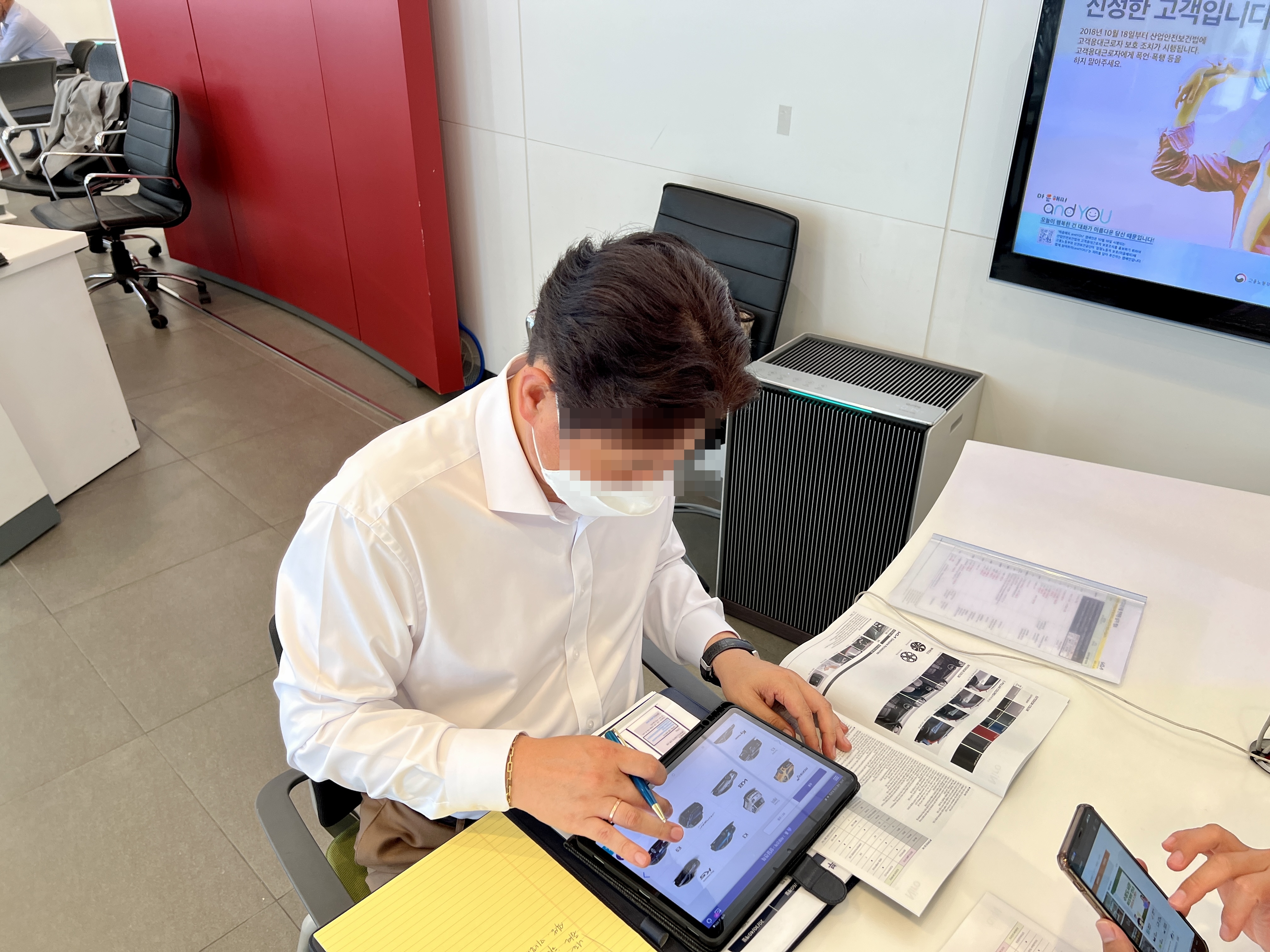 니로 플러스를 대신 시승해보고 바로 계약을 진행하였습니다. 신분증을 주고 차량과 옵션 및 색상을 선택하면