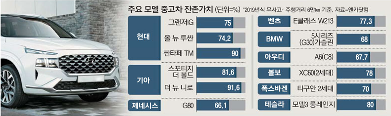 참고로 아래 엔카닷컴의 자료에 따르면 주요 모델 중고차 잔곤가치에서