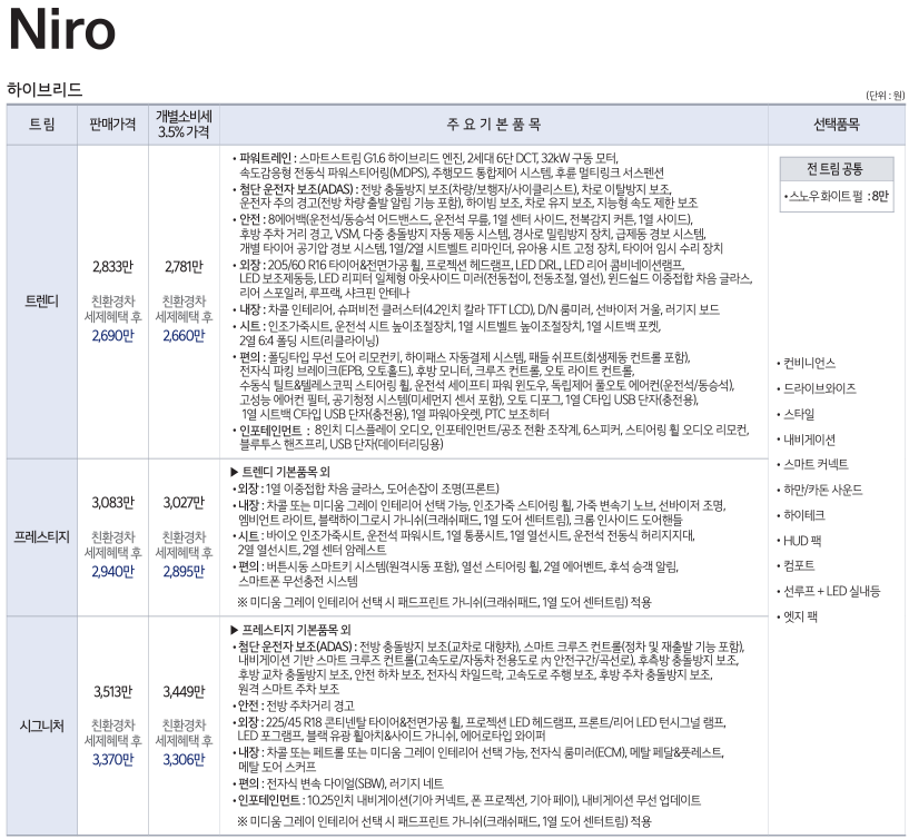 니로 하이브리드 옵션은 트렌디와 프레스티지 시그니처별로 다른데,