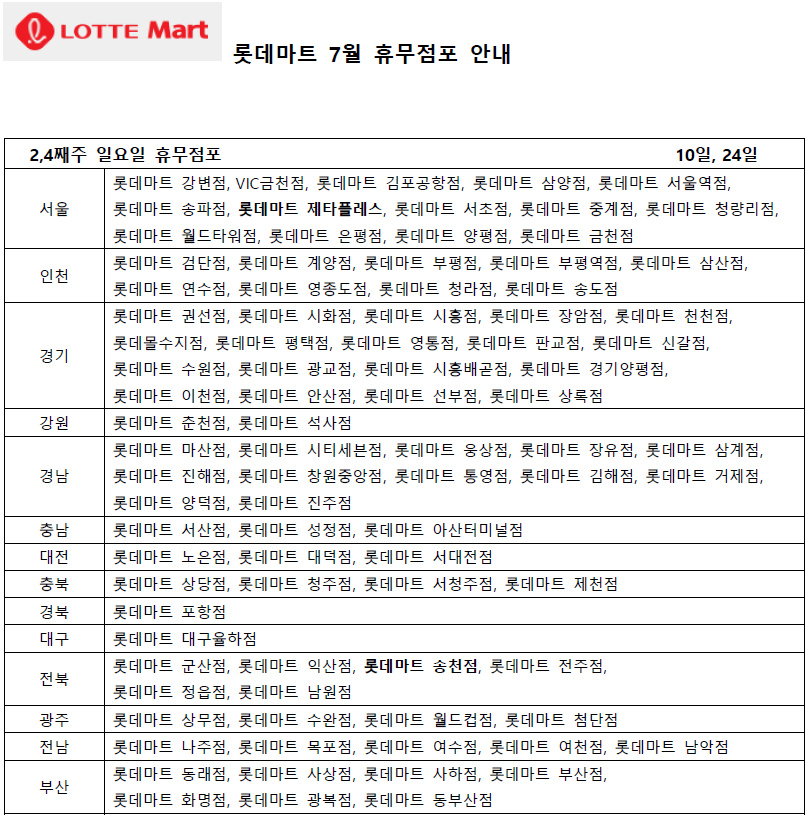 7월 롯데마트 휴무일 - 2,4째주 수요일