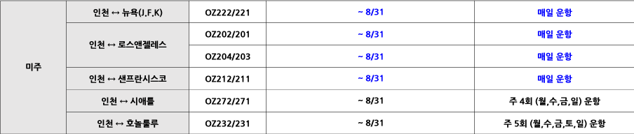 아시아나항공 7~8월 항공편 운항현황 - 미주노선