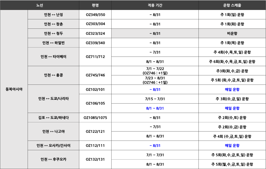 아시아나항공 7~8월 항공편 운항현황 - 동북아시아 노선