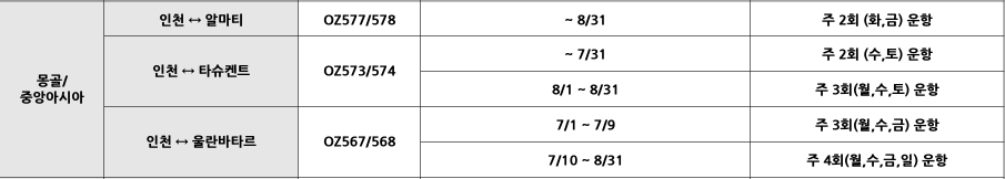 아시아나항공 7~8월 항공편 운항현황 - 몽골 / 중앙아시아노선