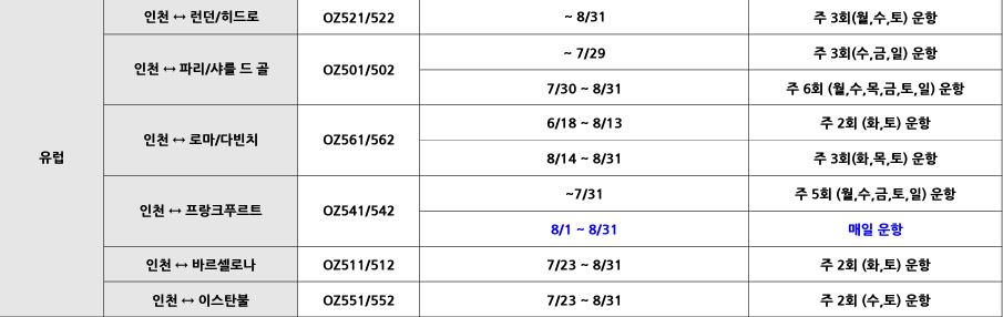 아시아나항공 7~8월 항공편 운항현황 - 유럽노선