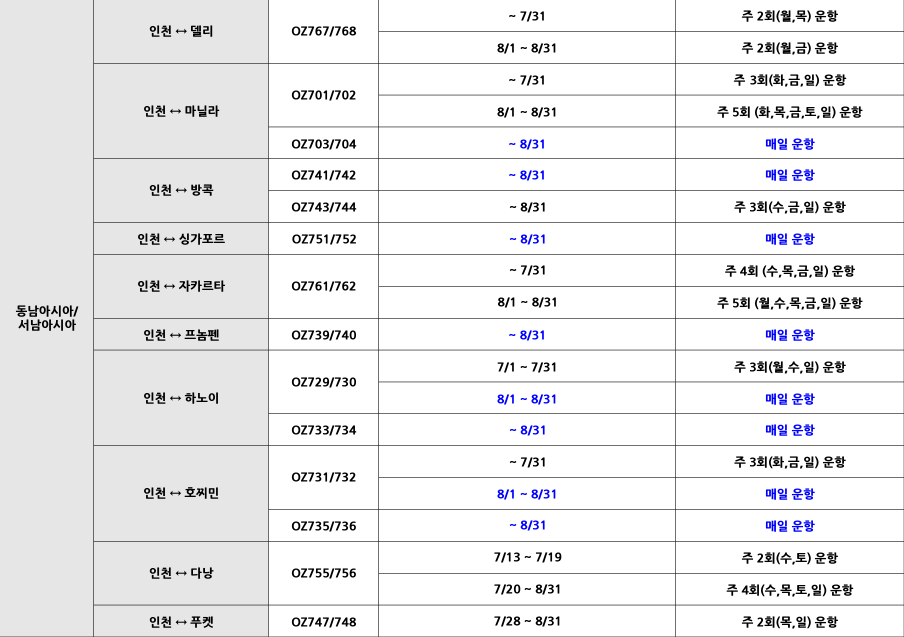 아시아나항공 7~8월 항공편 운항현황 - 동남아시아/서남아시아 노선