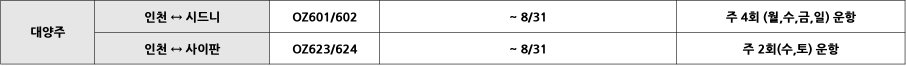 아시아나항공 7~8월 항공편 운항현황 - 대양주노선