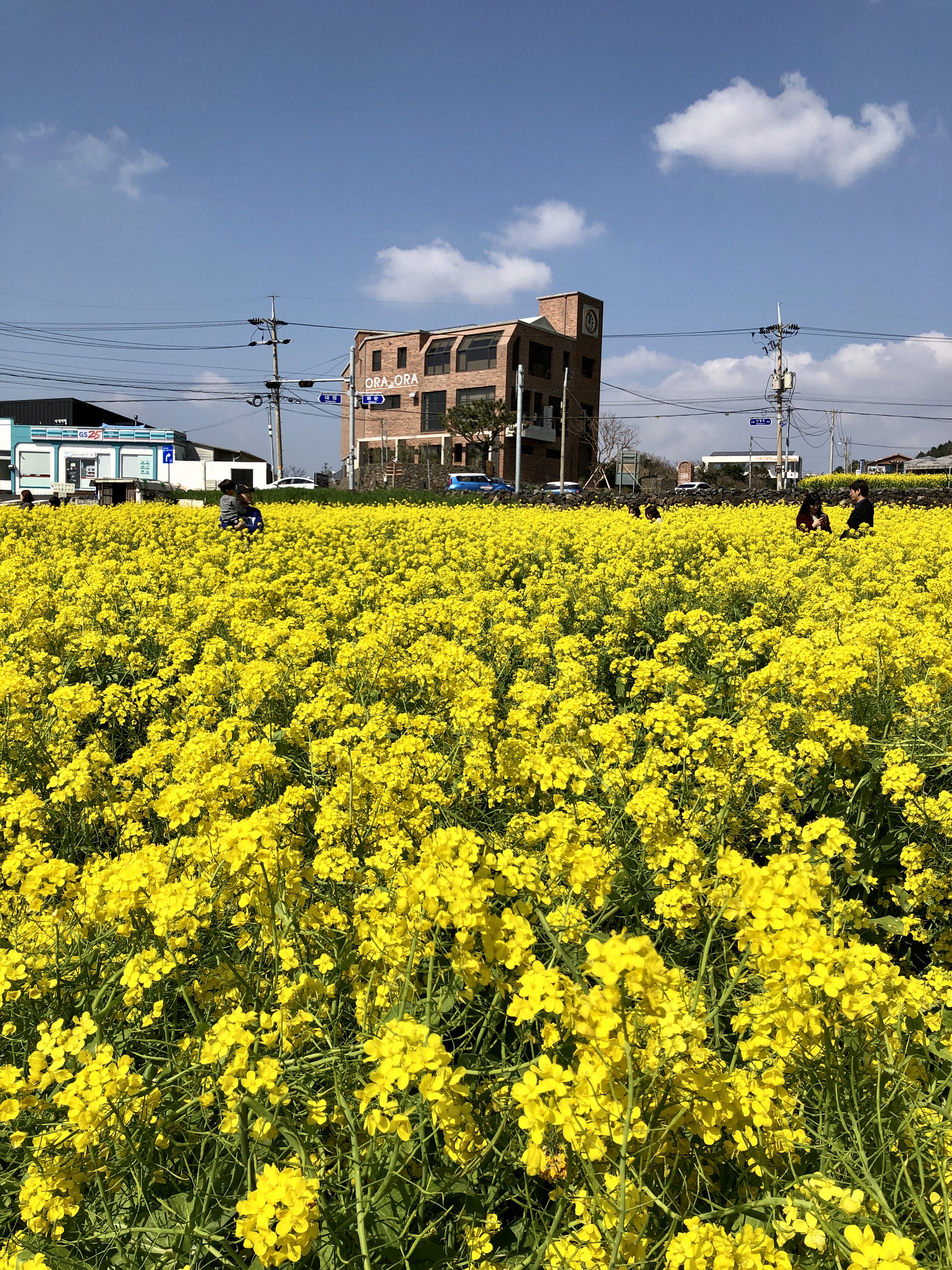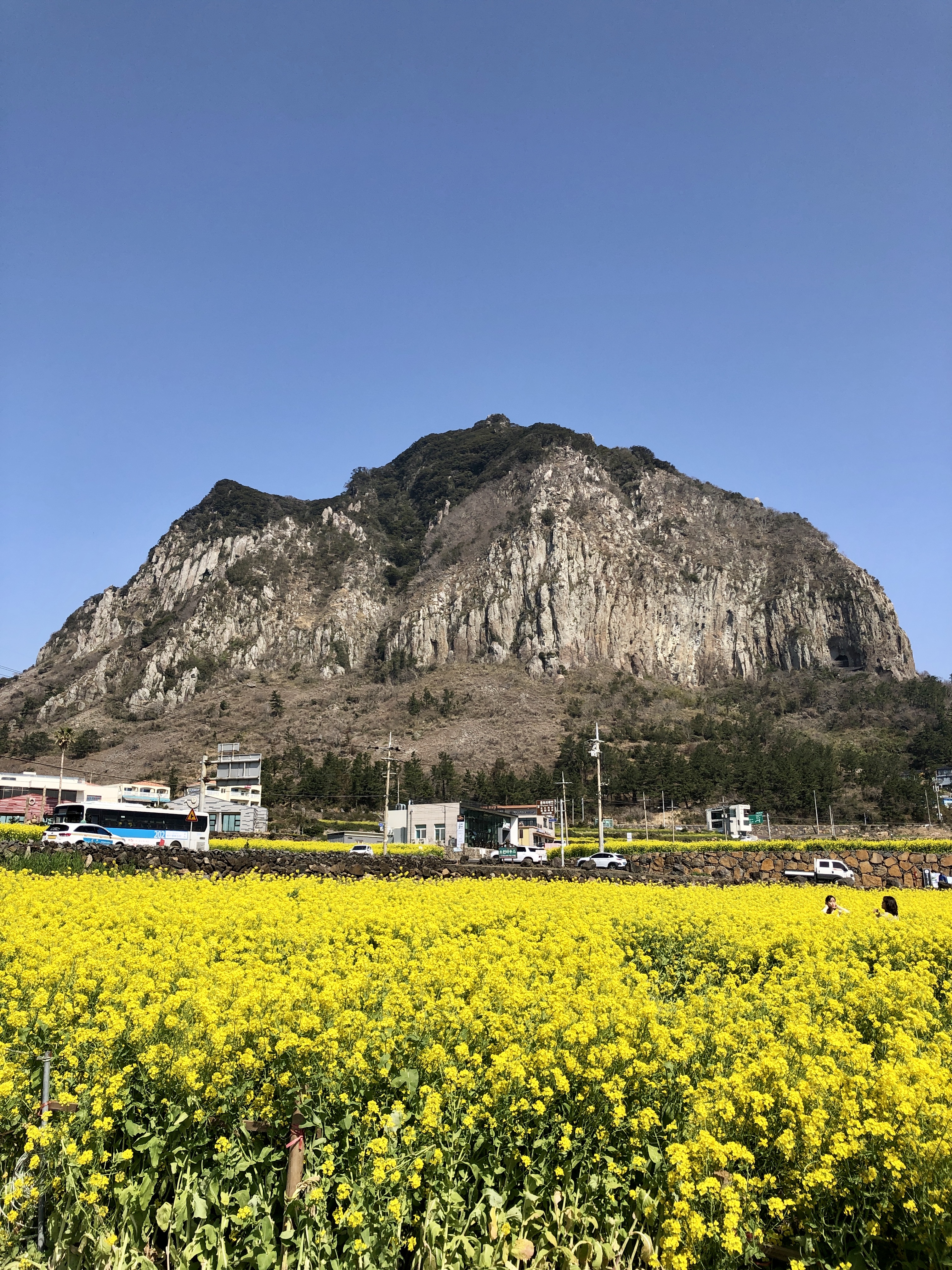 가는길에 산방산이 보이며 그 앞으로 만개한 유채꽃밭이 펼쳐진다.