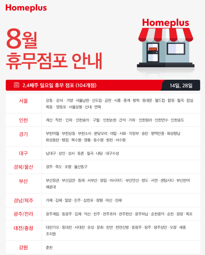 전국 대다수의 홈플러스 점포가 8월 2,4째 일요일인 8월 14일과 8월 28일에 휴무를 실시하게 됩니다.