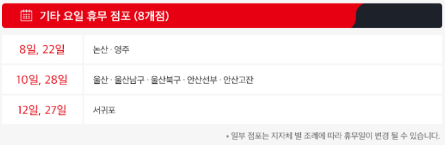 • 8월 10일, 8월 28일 휴무 - 안산고잔, 안산선부, 울산남구 홈플러스 , 울산북구 홈플러스 , 울산 홈플러스