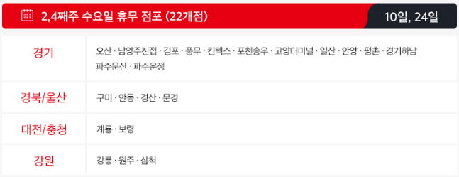 두번째로 2,4째주 수요일인 8월 10일과 8월 24일에도 22개의 홈플러스점포가 휴무하게 됩니다.