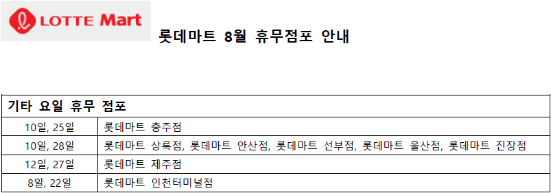 8월 롯데마트 휴무일 - 2,4째주 수요일